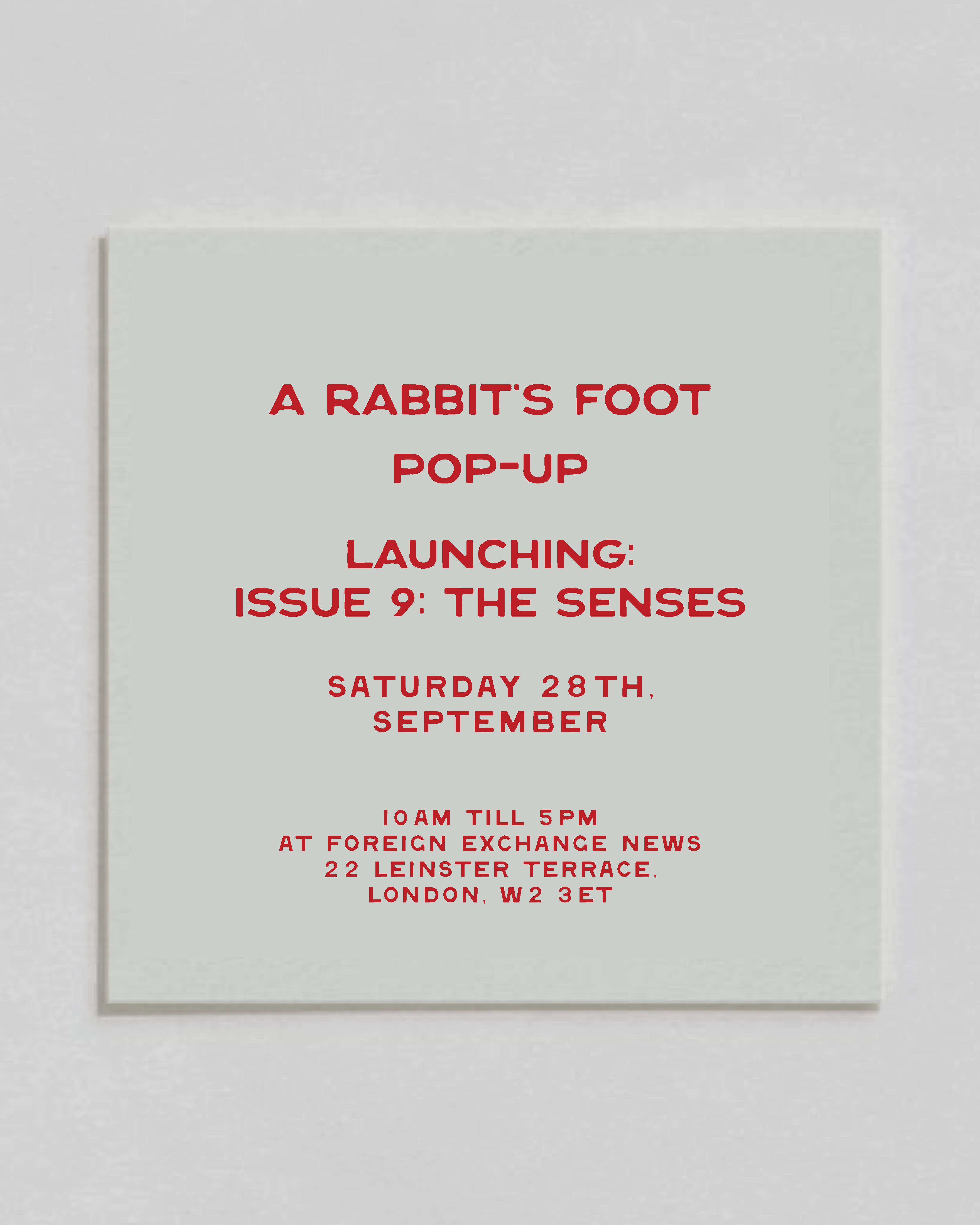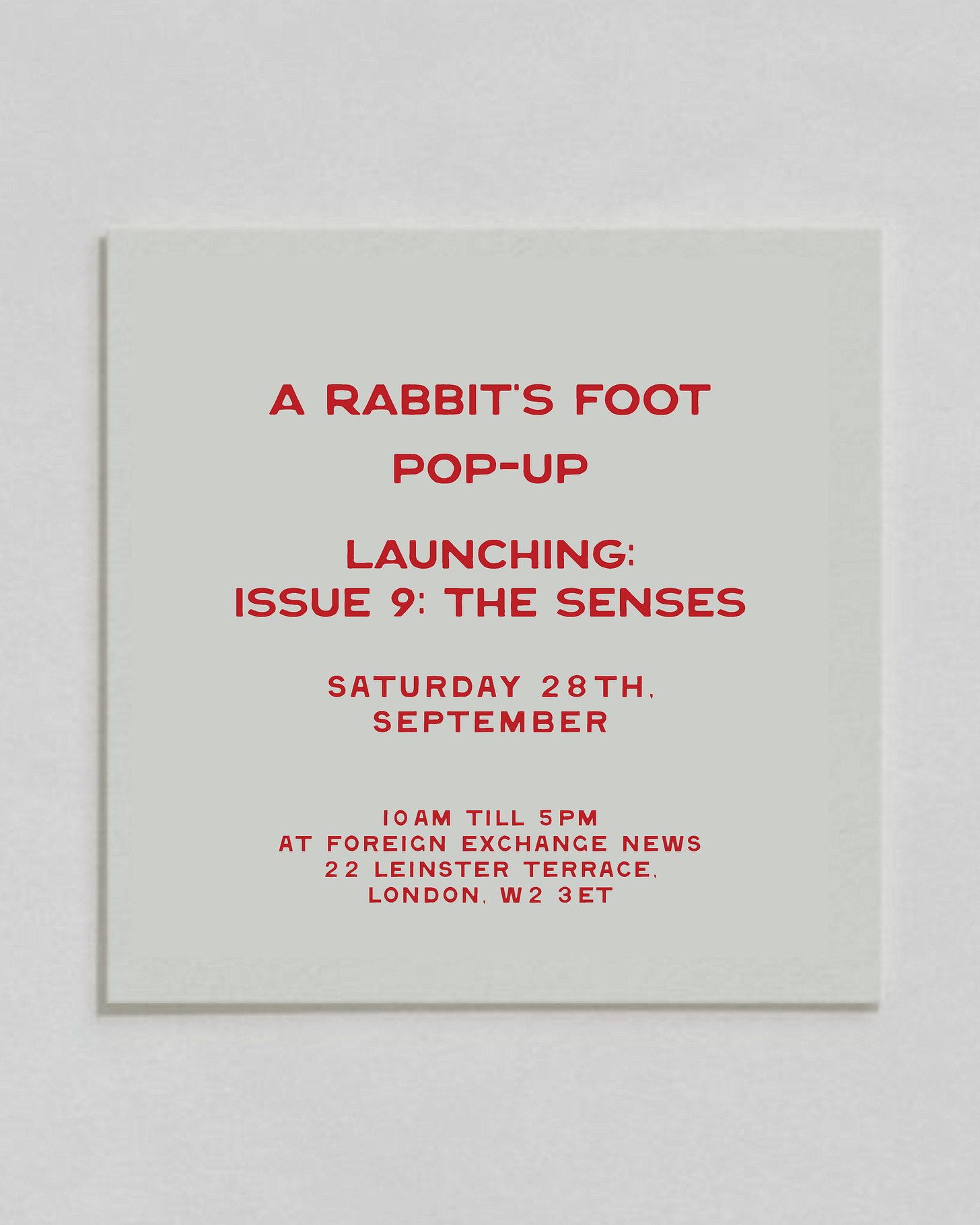 Join the team from A Rabbit’s Foot as we celebrate the launch of Issue 9: The Senses at Foreign Exchange News next Saturday, 28th September. This will be our readers’ first opportunity to get your hands on the latest edition—whose exciting cover stars and contributors are soon to be revealed. This will also be a echance to meet the editorial team and special guests as we take over one of West London’s most exciting coffee shops.